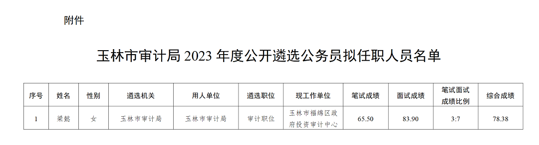 根据《玉林市2023年度公开遴选公务员公告》要求,经过公开报名、资格审查、笔试、面试、考察、体检等程序,确定梁懿同志(详见附件)为玉林市审计局2023年度公开遴选公务员拟任职人员,现予以公示,公示期为2023年10月9日至13日(5个工作日)。