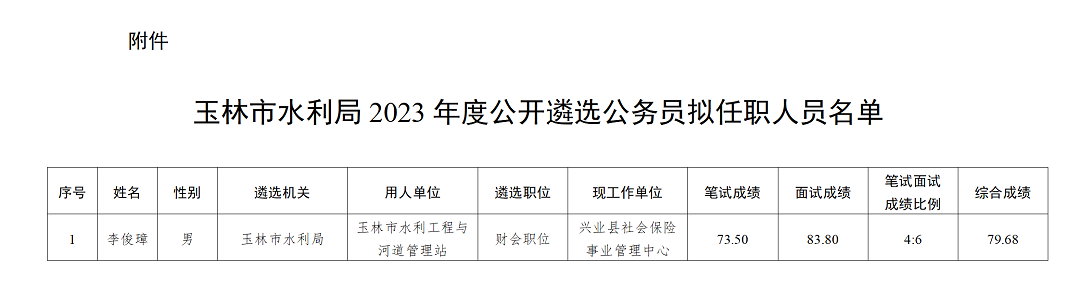 根据《玉林市2023年度公开遴选公务员公告》要求,经过公开报名、资格审查、笔试、面试、考察、体检等程序,确定李俊璋同志(详见附件)为玉林市水利局2023年度公开遴选公务员拟任职人员,现予以公示,公示期为2023年10月9日至13日(5个工作日)。