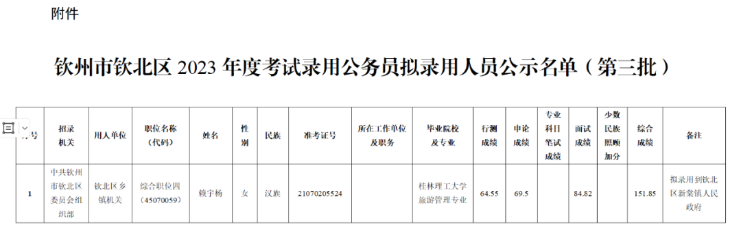 附件:钦州市钦北区2023年度考试录用公务员拟录用人员公示名单(第三批)