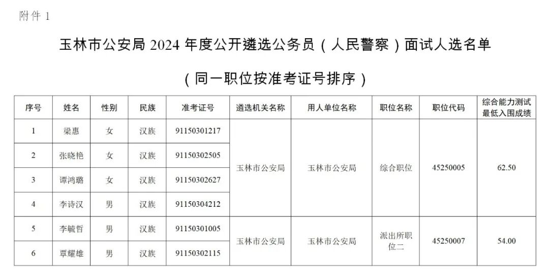 附件:1.玉林市公安局2024年度公开遴选公务员(人民警察)面试人选名单(同一职位按准考证号排序)