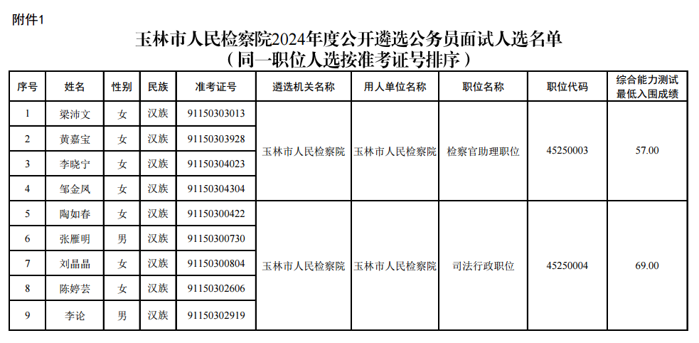 附件:1.玉林市人民检察院2024年度公开遴选公务员面试人选名单