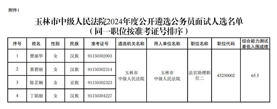 附件:1.玉林市中级人民法院2024年度公开遴选公务员面试人选名单(同一职位按准考证号排序)