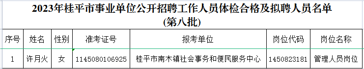 根据《2023年贵港市事业单位公开招聘工作人员公告》规定,经笔试、面试、考核、体检等程序,现对体检合格的拟聘用人员许月火同志予以公示,公示期7日。如对拟聘人员有异议,请以书面形式并署真实姓名和联系方式,于2024年8月7日前邮寄或直接送达桂平市人力资源和社会保障局事业单位人事和专业技术人员管理股。