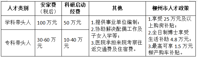 ①据职称给予48-98万元博士安家补助;②提供编制、协助解决配偶工作和子女入学;③给予10-40万元科研启动经费;④报销来院考察的交通费和住宿费用;⑤享提供过渡性免费租住房。⑥特殊人才一人一议。