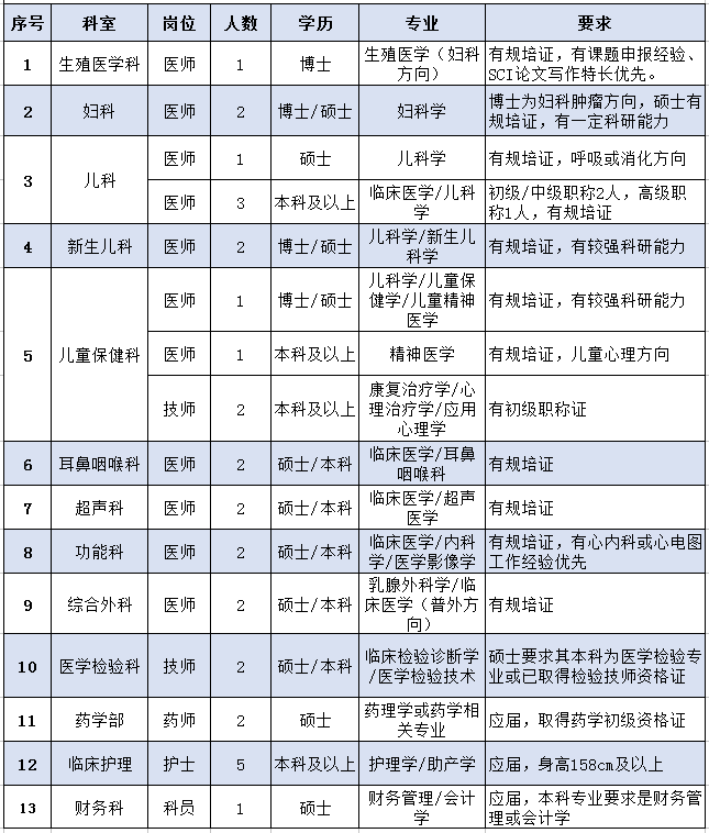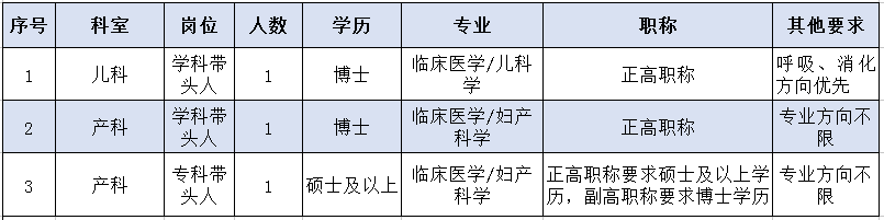 (4)其他情况,年龄要求:初级职称不超过30岁、中级职称不超过35岁、副高职称不超过45岁,正高职称不超过50岁;医师岗位要求四证齐全,即毕业证、学位证、医师资格证、规培证齐全。