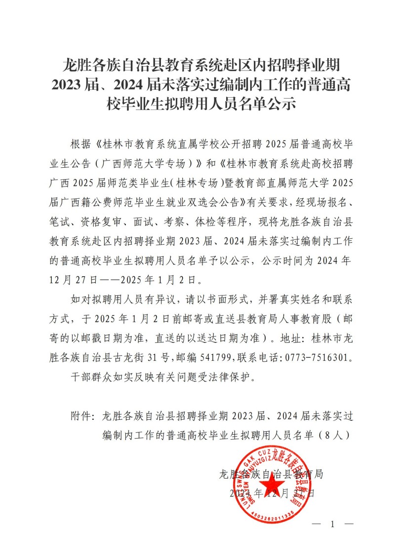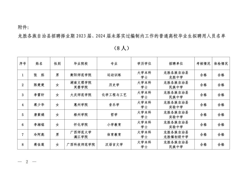 龙胜各族自治县教育系统赴区内招聘择业期2023届、2024届未落实过编制内工作的普通高校毕业生拟聘用人员名单公示