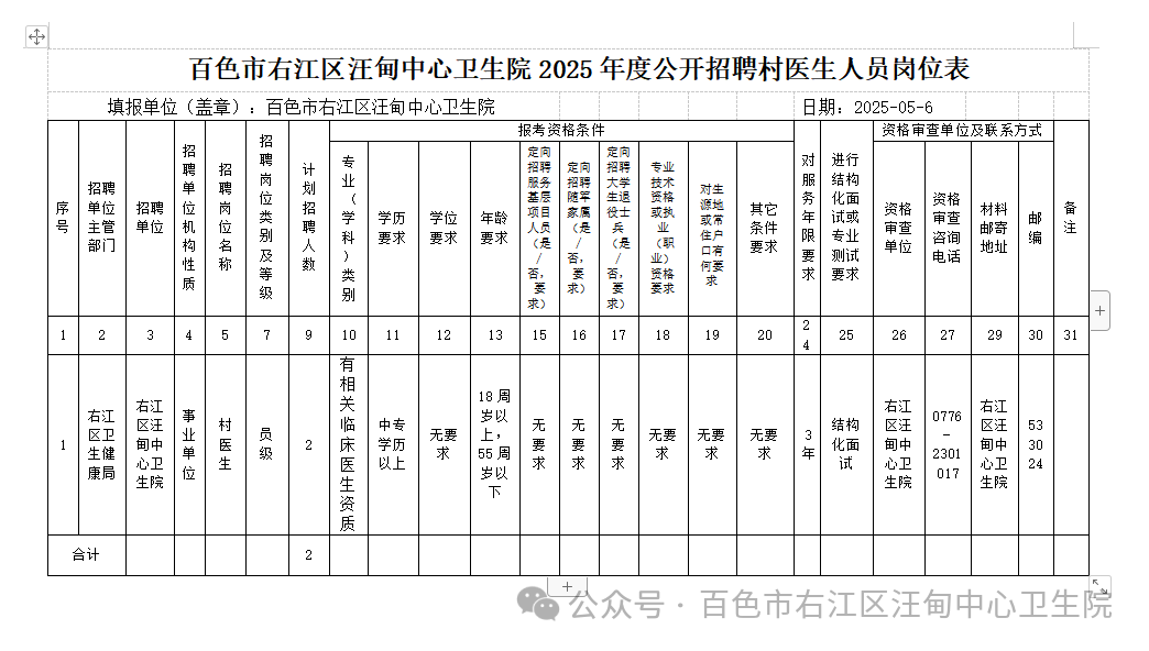 标签: 百色市右江区汪甸中心卫生院 村医生招聘 2025年度招聘 卫生院招聘 村医职位