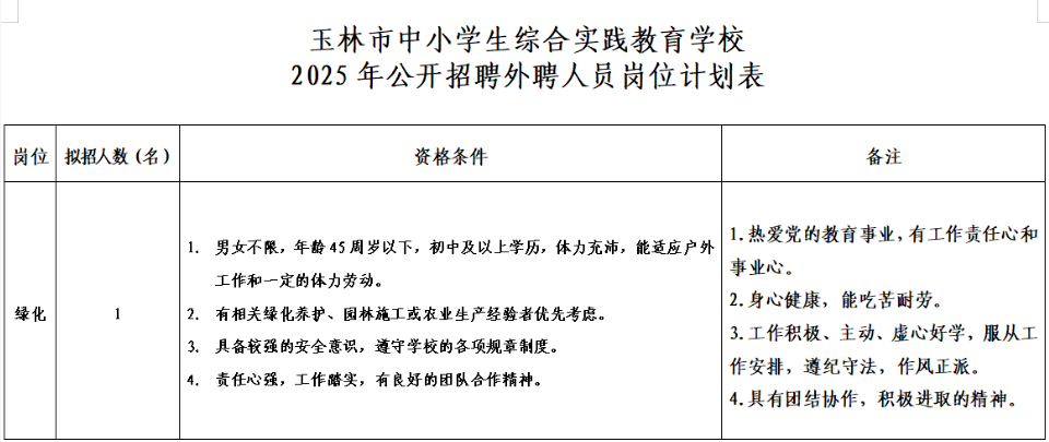 面向全市公开招聘玉林市中小学生综合实践教育学校外聘人员1名。