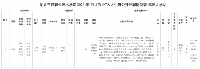 本次人才引进计划数共13人,涉及1个事业单位,共1个岗位,具体岗位详见附表《湖北三峡职业技术学院2026年“招才兴业”人才引进公开招聘岗位表·武汉大学站》(以下简称《岗位表》)。