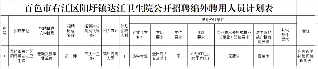 附件:右江区阳圩镇达江卫生院公开招聘编外聘用人员计划表