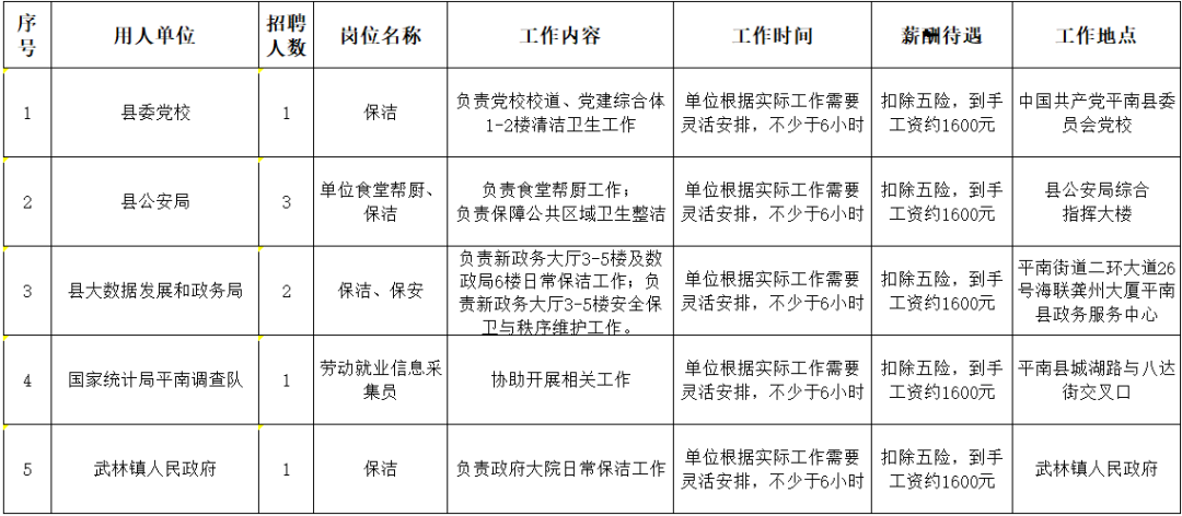 此次招聘会有县委党校、县公安局等共5家单位进场招聘,招聘人数8人,岗位为保洁、单位食堂帮厨、劳动就业信息采集员。