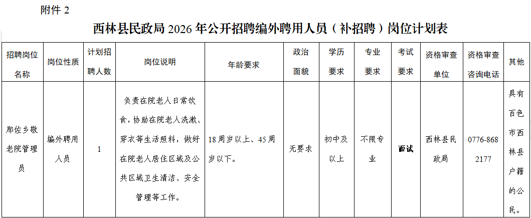 2.西林县民政局2026年公开招聘编外聘用人员(补招聘)岗位计划表