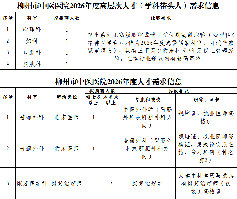 根据医院2026年的发展规划,本着按需招聘,贯彻“公开、公平、公正、竞争、择优”原则,现将柳州市中医医院2026年人才招聘有关事项公告如下: