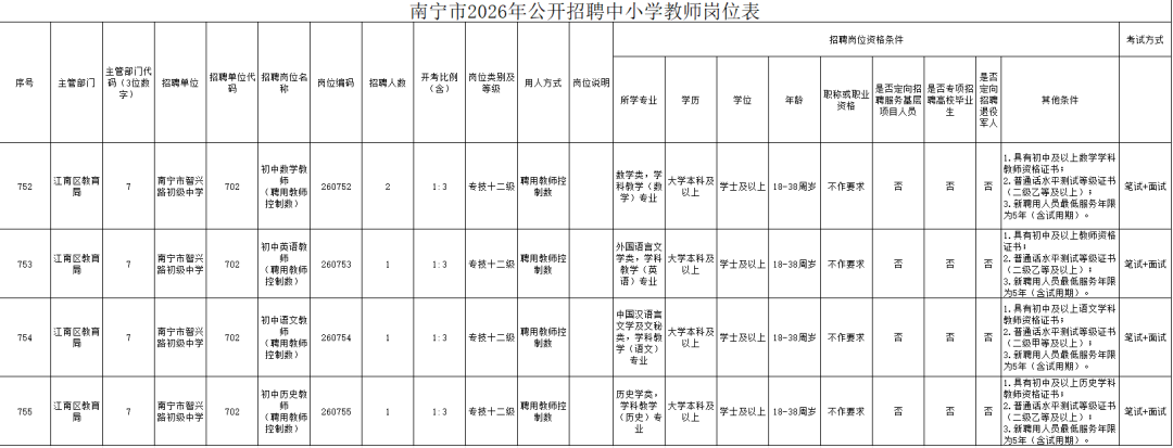 南宁市2026年公开考试招聘中小学教师岗位表(南宁市智兴路初级中学)