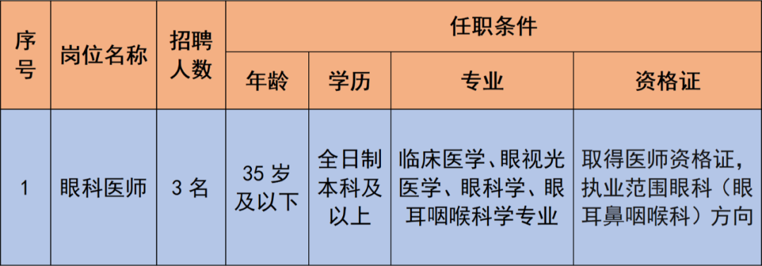 根据科室业务发展需要,面向社会公开招聘眼科医师3名,具体岗位要求如下: