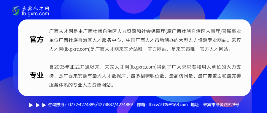 本次公开招聘公告和拟聘人员公示均在来宾人才网(https://lb.gxrc.com)发布。报名人员在报名期间,应关注上述信息发布渠道,及时了解最新情况并保持通讯工具畅通,有疑问时及时与招聘单位联系咨询。报名人员因个人原因错过信息而影响面试聘用的,自行承担责任。