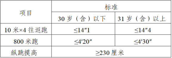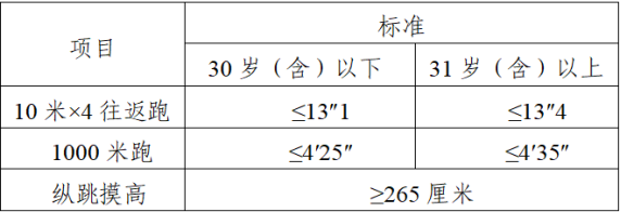 体能测评三项全部达标方为合格。具体测评规则按照有关规定执行。体能测评项目中,纵跳摸高的测试次数不超过3次,10米×4往返跑的测试次数不超过2次,长跑项目(男子1000米/女子800米)的测试次数为1次。体能测评达标的报考人员进入下一个环节。