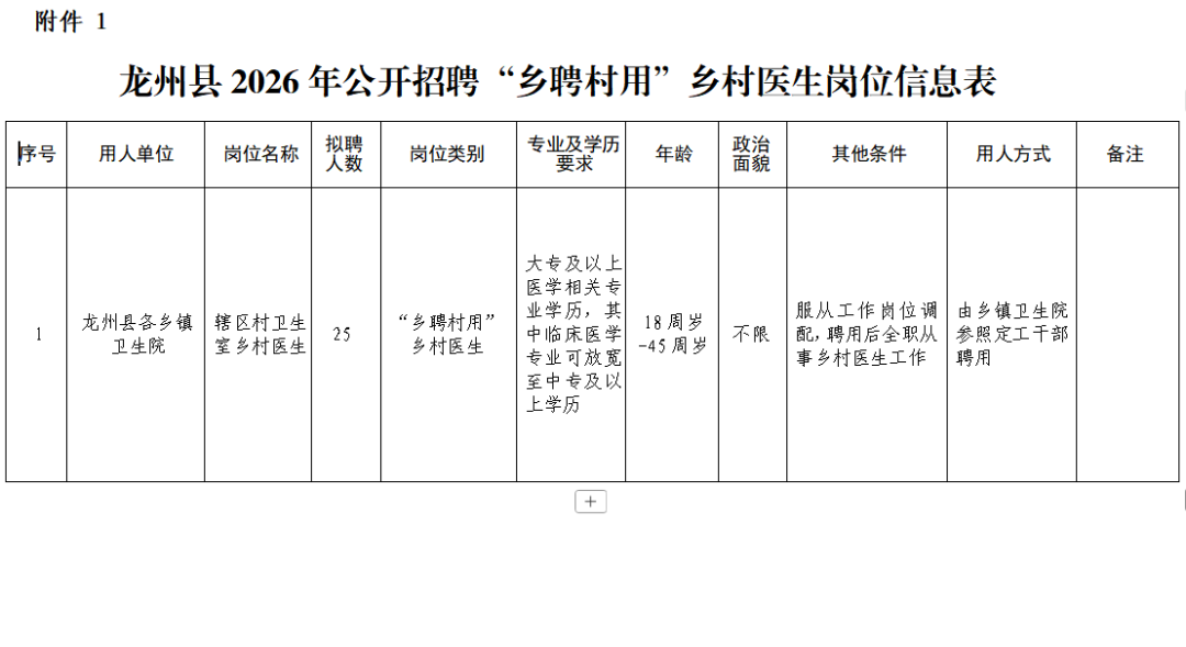 1.龙州县2026年公开招聘“乡聘村用”乡村医生岗位信息表