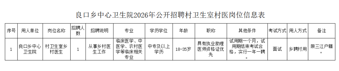 因工作需要,我院拟向社会公开招聘乡村医生1名,现将有关招聘事项公告如下: