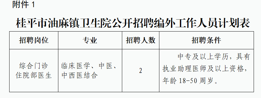 桂平市油麻镇卫生院是一所集医疗、预防、保健为一体的综合性一级公立乡镇卫生院,根据卫生院业务发展和人才队伍建设需要,经研究,油麻镇卫生院现面向社会公开招聘2名编外工作人员,现将有关事项公告如下: