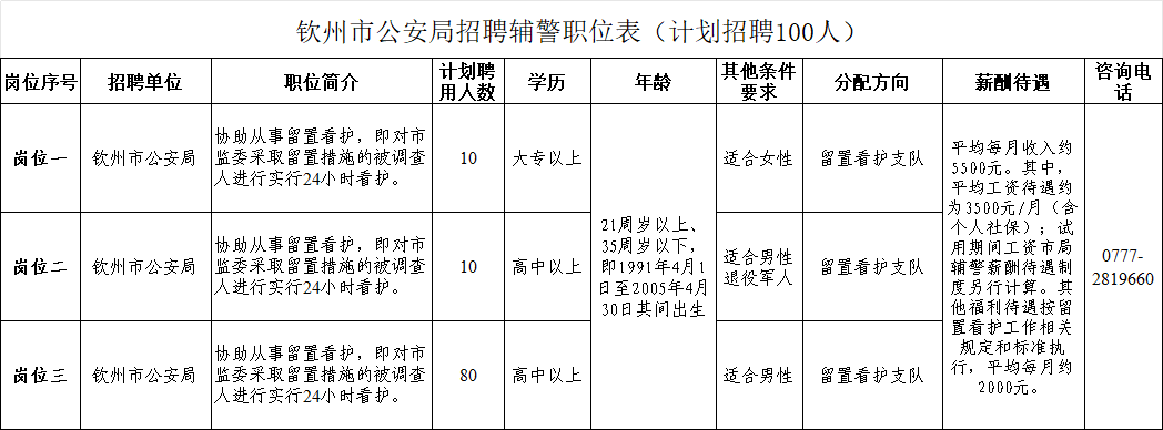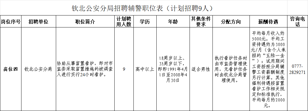 岗位四:9人,钦北分局留置看护辅警岗位,适合男性,高中(含中专)以上学历。