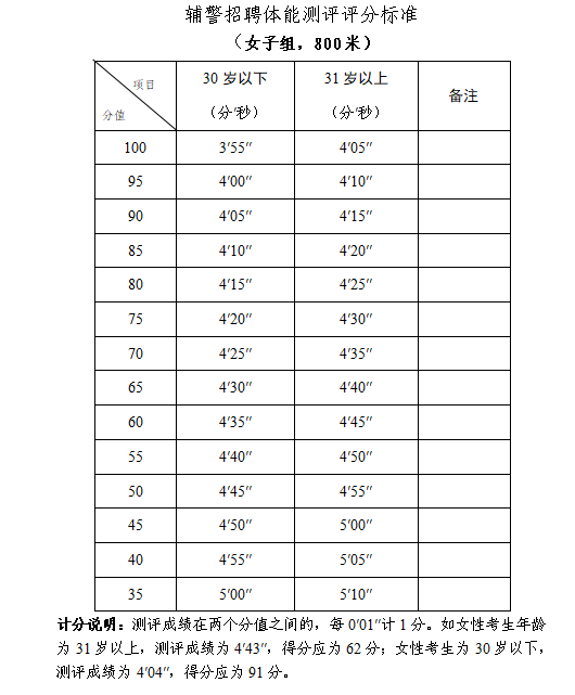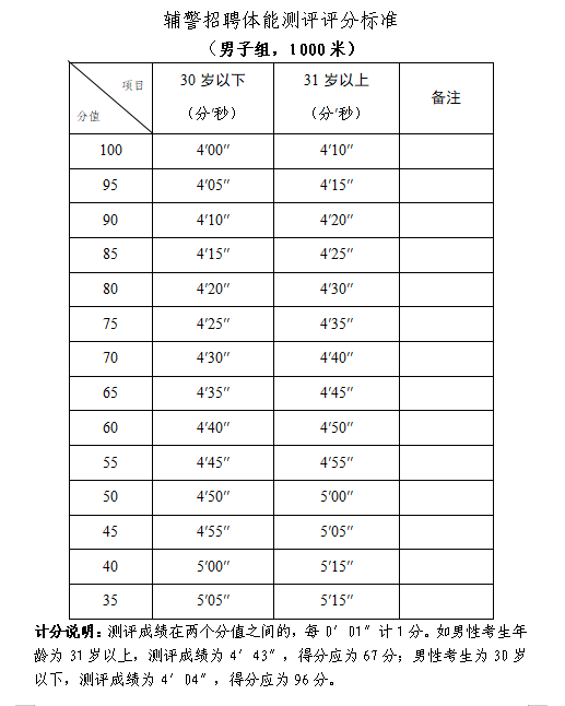 1.体能测试。资格审查合格的考生参加体能测试。体能测试项目为长跑(男子1000米,女子800米),体能测试计算成绩,评分标准附后。