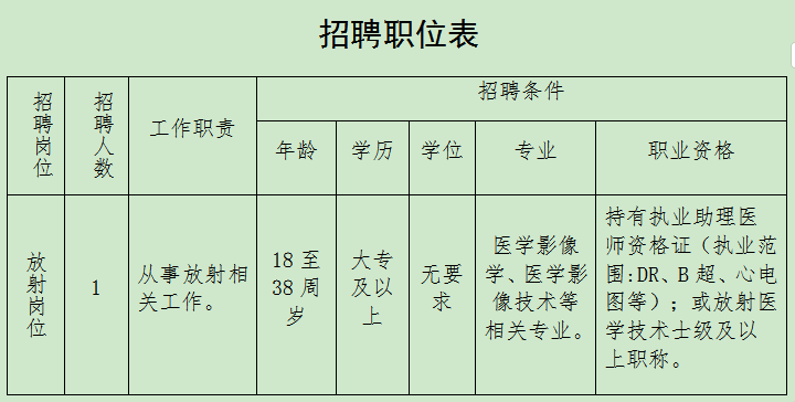 我院计划公开招聘放射岗位人员1名,具体招聘岗位、条件及报名方式如下: