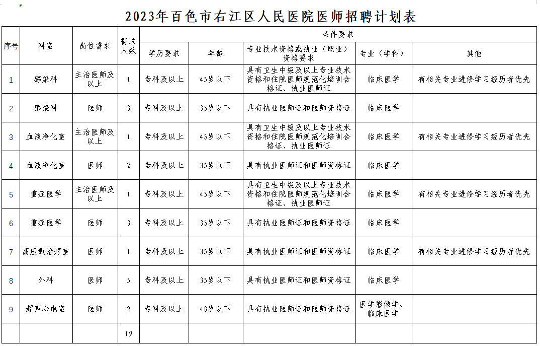 因工作需要,百色市右江区人民医院急需招聘编外聘用人员,坚持德才兼备的用人标准,贯彻公开、平等、竞争、择优的原则,公开报名,统一考试,严格考核、择优聘用,保证我院招聘工作的公平公正,为我院提供人才保障,具体招聘事宜如下: